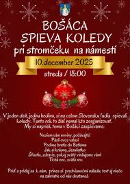 BOŠÁCA SPIEVA KOLEDY Spievať budeme v stredu 10. 12. 2025 o 18:00 na námestí pri vianočnom stromčeku, rovnako ako naši kamaráti z družobných obcí v Březovej a Horních Ředicích. V Bošáci si zaspievame: Nesiem vám noviny, počúvajte! Pásli ovce valasi Poďme bratia do Betléma Jak si krásne, Jezuliatko Šťastie, zdravie, pokoj svätý vinšujeme vám! Tichá noc, svätá noc Príď a pridaj sa k nám, prines si predvianočnú náladu, text aj niečo na zahriatie od nás dostaneš.
