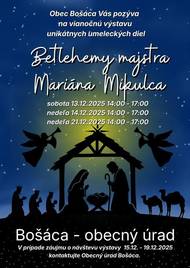 Obec Bošáca Vás pozýva na vianočnú výstavu unikátnych umeleckých diel Betlehemy majstra Mariána Mikulca Bošáca - obecný úrad sobota 13.12.2025 14:00 - 17:00 nedela 14.12.2025 14:00 - 17:00 nedeľa 21.12.2025 14:00 - 17:00 Pozývame vás na výstavu starších i tých najnovších diel majstra Mariána Mikulca. Príďte sa zastaviť, nadýchnuť pokoja, vychutnať si adventné obdobie a objaviť krásu, ktorú dokáže vytvoriť ľudské srdce a ruky. Tešíme sa na vás. V.prípade záujmu o návštevu výstavy 15.12. - 19.12.2025 kontaktujte Obecný úrad Bošáca.