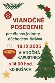 Výbor ZO JDS Bošáca pozýva svojich členov na Vianočné posedenie s programom: Úcta jubilantom Mikuláš Vianočná kapustnica vo štvrtok 18.12.2025 o 14:00 hod. v Kultúrnom dome Bošáca. Tešíma sa na Vašu účasť. Výbor ZO JDS Bošáca