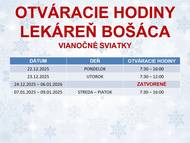 Vedúca lekárne v Bošáci informuje občanov a návštevníkov, o otváracáích hodinách počas Vianočných sviatkov . Ďakujeme za pochopenie.