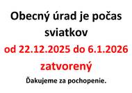 Obecný úrad v Bošáci a Zberný dvor Bočáca bude v dňoch 22. 12. 2025 do 6. 1. 2026 ZATVORENÝ z dôvodu čerpania dovolenky. Budeme tu pre Vás opäť od 7. januára 2026.