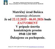 Matričný úrad Bošáca oznamuje občanom že od 22.12.2025 - 06.01.2026 bude ZATVORENÝ. V prípade úmrtia kontaktujete prosím 0948 130 989. Ďakujeme za pochopenie.