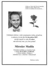 S hlbokým žiaľom v srdci oznamujeme rodine, priateľom a známym, že nás dňa 14. decembra 2025 navždy opustil vo veku 32 rokov náš milovaný otec, syn, brat, priateľ p. Miroslav Madila Posledná rozlúčka so zosnulým bude v sobotu 20.12.2025 o 13:00 hod. v Dome smútku v Bošáci a následne na ev. cintoríne v Haluziciach. Smútiaca rodina