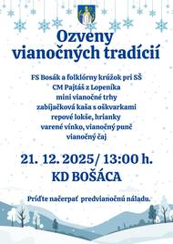 Ozveny vianočných tradícií nedeľa 21. 12. 2025 / 13:00 hod. KD BOŠÁCA s nasledovným programom: FS Bosák a folklórny krúžok pri SŠ CM Pajtáš z Lopeníka mini vianočné trhy zabíjačková kaša s oškvarkami,repové lokše, hrianky, varené vínko, vianočný punč,vianočný čaj Príďte načerpať predvianočnú náladu.