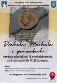 Miestny odbor Matice Slovenskej Bošáca Vás pozýva na podujatie Drahoslav Machala v spomienkach, ktoré sa uskutoční v sobotu 17.1.2026. PROGRAM: 14:30 položenie venca k pamätnej tabuli pri rodnom dome v Zemianskom Podhradí 15:00 spomienkové stretnutie v Kultúrnom dome Bošáca klubovňa