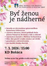Milé dámy, v sobotu 7.3. o 15.00 nechajte starosti doma, vezmite kamarátku, dcéru, mamu či sestru a príďte si užiť popoludnie do KD v Bošáci, ktoré bude patriť len vám. Čaká nás stretnutie plné inšpirácie, umenia, oddychu, úsmevov aj príjemných rozhovorov pri káve. Chceme, aby ste sa cítili výnimočne. Tešíme sa na spoločné chvíle.