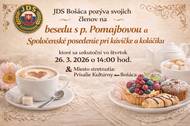 JDS Bošáca pozýva svojich členov na besedu s p. Pomajbovou a spoločenské posedenie pri kávičke a koláčiku, ktoré sa uskutoční vo štvrtok 26.3.2026 o 14:00 hod. Miesto: prísalie KD Bošáca. Prihlásenie sa na výlet do Bratislavy, spojený s obedom a prehliadkou parlamentu a Bratislavského hradu dňa 13.4.2026 Tešíma sa na Vašu účasť. Výbor ZO JDS Bošáca