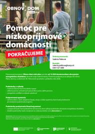 Slovenská agentúra životného prostredia pripravuje novú výzvu Obnov dom mini plus určenú pre domácnosti ohrozené energetickou chudobou až pre 16 000 rodinných domov. Cieľ programu: zníženie energetickej náročnosti bývania, pomoc pri znižovaní výdavkov na energie. Podporované opatrenia (po oficiálnom zverejnení): výmena okien a dverí, zateplenie fasády, zateplenie stropu, ďalšie opatrenia, ktoré predstavíme pri vyhlásení výzvy. V prípade záujmu kontaktujte terénneho pracovníka SAŽP – Valéria Palková, e-mail: valeria.palkova@sazp.sk telefón: 0917 127 889 Konzultácie sú bezplatné.