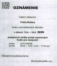 Pošta Bošáca bude z prevádzkových dôvodov v stredu 15.4.2026 zatvorená. Vo štvrtok 16.4.2026 bude otvorená v čase od 8.00 - 13.00 a od 14.00 – 17.00 hod. Ďakujeme za porozumenie. Slovenská pošta a.s.