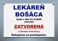 Vedúca lekárne v Bošáci informuje občanov a návštevníkov, že v utorok dňa 21.04.2026 bude lekáreň ZATVORENÁ. Ďakujeme za pochopenie.