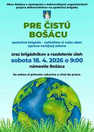 Obec Bošáca v spolupráci s dobrovoľnými organizáciami pozýva všetkých ochotných občanov na spoločnú brigádu 👉 Vyčistime si našu obec a upravme verejnú zeleň 📅 Sobota 18. 4. 2026 🕘 o 9:00 hod. 📍 zraz: námestie Bošáca (rozdelenie úloh) 🧤 So sebou si prineste rukavice a chuť do práce Spoločne dokážeme viac – tešíme sa na vás! 💚