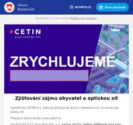 Společnost CETIN a.s. plánuje připojovat domy v Boskovicích na novou optickou síť. Připojení domu bude zcela zdarma. Společnost O2 Czech Republic a.s. začne od 22. ledna zjišťovat pro společnost CETIN zájem obyvatel o tato připojení. Zjišťování bude probíhat cca měsíc.