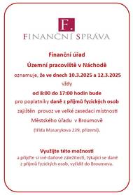ℹ️ Finanční úřad, Územní pracoviště v Náchodě, ve spolupráci s městem Broumov (zdarma poskytne prostory) zajistí opětovně pro občany Broumovska možnost vyřízení daňových záležitostí, týkajících se daně z příjmů fyzických osob, přímo v Broumově. Více informací viz leták.