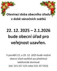 Obecní úřad Božice bude od 22.12.2025 do 2.1.2026 pro veřejnost uzavřen. V pondělí 22. a 29. prosince 2025 bude možné obecní úřad navštívit po předchozí telefonické domluvě. Děkujeme za pochopení.