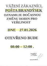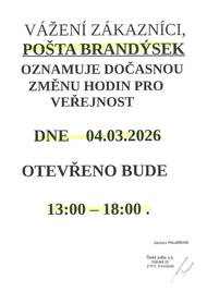 Oznamujeme občanům, že dne 4. 3. 2026 bude pošta Brandýsek otevřena v čase 13:00 - 18:00 hod. Děkujeme za pochopení.