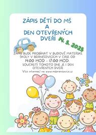 MŠ Branišovice oznamuje, že zápis do MŠ se koná ve středu 14.5. od 14:00 do 17:00 hod. v budově mateřské školy. Současně probíhá i den otevřených dveří. Více informaci na www.msbranisovice.cz