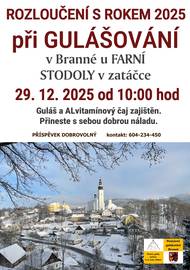 Srdečně vás zveme na rozloučení s rokem 2025 při gulášování 🍲 📍 Branná – u farní stodoly v zatáčce 🗓 29. 12. 2025 ⏰ od 10:00 hodin 👉 Guláš a Alvitamínový čaj zajištěn 👉 Přineste si s sebou dobrou náladu 💰 Příspěvek dobrovolný 📞 Kontakt: 604 234 450 Těšíme se na setkání s vámi!