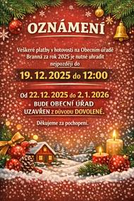 Vážení spoluobčané, veškeré platby, které je nutno uhradit v hotovosti na OÚ Branná za rok 2025, je možné zaplatit nejpozději 19.12.2025 do 12:00 hodin. Od 22.12.2025 do 2.1.2026 DOVOLENÁ.