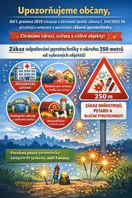 Vážení spoluobčané, od 1. prosince 2025 vstupuje v účinnost novela zákona č. 344/2025 Sb., která přináší významná omezení v používání zábavní pyrotechniky. Cílem nové právní úpravy je lepší ochrana zdraví, zvířat a citlivých objektů, pro které mohou být hlučné výbuchy rizikem. Nově je zakázáno odpalovat většinu pyrotechnických výrobků – tedy především ohňostroje, silnější petardy a další hlučnou či zábleskovou pyrotechniku – v okruhu 250 metrů od vybraných zařízení a míst. Mezi tyto objekty patří například: zdravotnická zařízení, domovy pro seniory a další sociální služby, útulky pro zvířata, zoologické zahrady a záchranné stanice, hospodářství s chovem evidovaných zvířat. Mapa omezení Zákaz se nevztahuje na pyrotechniku kategorie F1, tedy na výrobky velmi malé intenzity, jako jsou prskavky či malé fontány.