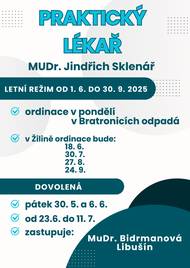 Vzhledem k aktuálním změnám oznamujeme, že ordinace MUDr. Jindřicha Sklenáře v pondělí v Bratronicích odpadá. Pacienti mohou navštívit ordinaci v Žilině v termínech 18. 6., 30. 7., 27. 8. a 24. 9. Dále upozorňujeme na dovolenou od 23. 6. do 11. 7., kdy zastupuje MUDr. Bidrmanová v Libušíně.
