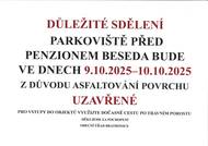 Parkoviště před penzionem BeSeDa bude z důvodu asfaltování povrchu uzavřeno ve dnech 9. a 10. října 2025. Děkujeme za pochopení.