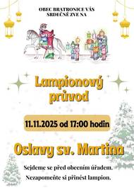 Obec Bratronice vás srdečně zve na lampionový průvod k oslavě svatého Martina, který se koná 11. listopadu 2025 od 17:00 hodin. Sejdeme se před obecním úřadem, nezapomeňte si přinést lampion.