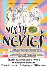 Obec Brestovec Vás srdečne pozýva občanov vo štvrtok 30. apríla 2026 o 19,00 hod. do Kultúrneho domu v Brestovci na divadelné predstavenie Divadla LUSIAN pod názvom "NIKDY NEVIEŠ". Cena vstupenky je 3,- Eurá a vstupenky sú už v predaji na obecnom úrade v Brestovci v čase úradných hodinách úradu.