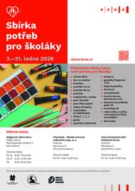Oddělení prorodinné politiky Odboru zdraví MMB ve spolupráci s příspěvkovými a neziskovými organizacemi v Brně připravilo již devátý ročník městské sbírky tentokráte potřeb pro školáky. Tímto dobročinným skutkem na začátku nového roku pomůžete dětem v příspěvkových a neziskových organizacích ve městě Brně. Více informací se dozvíte na stránkách: 2.–31. 1. 2026 | Sbírka potřeb pro školáky – Zdraví Brno