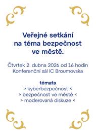 Před 27 dnyVeřejné setkání na téma bezpečnost ve městěVeřejné setkání na téma bezpečnost ve městě. Čtvrtek 02.04.2026 od 16:00 h – Konferenční sál IC Broumovska. Zve vedení města.