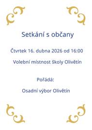 Před 12 dnyOsadní výbor Olivětín zve na setkání s občany - 16.04.2026 od 16:00 h - OlivětínPředáváme pozvánku Osadního výboru Olivětín.