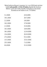 Místní knihovna Brumov oznamuje, že v roce 2026 bude otevřeno každé sudé pondělí od 18 do 19 hodin případně dle domluvy. Více informací naleznete v přiložené fotografii.
