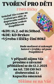 ZVEME VÁS NA TVOŘENÍ FIMO LŽIČEK 14.2.OD 16:30 V KD BRZKOV VÝROBA 1 LŽIČKY STOJÍ 80 KČZÁVAZNÉ PŘIHLÁŠENÍ DO 12.2. NA TEL 720 130 563.