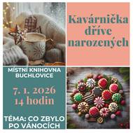 Zveme naše seniory na tradiční Kavárničku, tentokrát na téma "Co zbylo po vánocích", která se koná ve středu 7. ledna od 14 hodin v Místní knihovně Buchlovice. Domluvená návštěva Domova pro seniory se z důvodu omezení návštěv přesouvá.