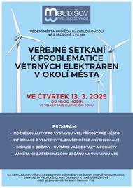 Vedení města Budišov nad Budišovkou zve občany na veřejné setkání zaměřené na problematiku výstavby větrných elektráren v okolí. Během akce se probere možné lokality, přínosy pro město a vlivy VTE, a také se uskuteční diskuze s občany a anketa o názorech na tuto výstavbu.