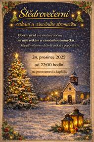 Obecní úřad zve všechny občany na milé setkání u vánočního stromečku, kde se můžeme na chvíli potkat a popovídat si. 📅 24. prosince 2025 🕙 od 22:00 hodin 📍 na prostranství u kapličky Přijďte se na chvíli zastavit a užít si klidnou vánoční atmosféru. Těšíme se na vás ✨