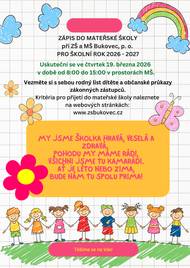 Základní škola a Mateřská škola Bukovec informuje o zápisu dětí do mateřské školy pro školní rok 2026/2027. Zápis se uskuteční ve čtvrtek 19. března 2026 od 8:00 do 15:00 hodin. Všechny zájemce prosíme, aby si přinesli občanský průkaz a rodný list dítěte, které budou potřebné k zápisu.