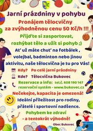 Využijte jarní prázdniny k aktivnímu odpočinku v tělocvičně Bukovec za zvýhodněnou cenu 50 Kč za hodinu. Přijďte se s rodinou nebo přáteli pobavit a zasportovat, ať už máte rádi fotbálek, volejbal nebo badminton. Nezapomeňte si rezervovat místo, kapacita je omezená. Více viz plakát.