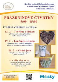 Gorolské turistické informační centrum srdečně zve do Dřevěnky na Fojtství v Mostech u Jablunkova na tematické dílničky určené pro rodiny s dětmi, které se uskuteční během prázdninových čtvrtků, a to 19.2. a 26.2. od 9:00 do 15:00 hod. Více informací viz plakát.