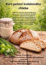 Rádi byste si dopřáli zdravý a chutný chléb, který provoní Váš domov? Neváhejte a přihlaste se na kurz, kde získáte praktické rady, jak na to. Kurz proběhne dne 21. 4. 2026 od 16 h ve volnočasové místnosti na Obecním úřadě v Bukovci. Kapacita omezená - rezervace nutná. Více viz níže a plakát.