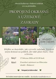 Obecní knihovna v Bukovci srdečně zve na přednášku "Propojení okrasné a užitkové zahrady", která se uskuteční dne 17. 3. 2026 od 15:30 hod. v zasedací místnosti na Obecním úřadě v Bukovci. Více informací viz plakát.