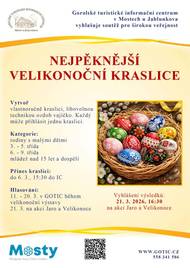 Gorolské turistické a informační centrum v Mostech u Jablunkova vyhlásilo u příležitosti tradiční akce Jaro a Velikonoce soutěž pro veřejnost o NEJPĚKNĚJŠÍ VELIKONOČNÍ KRASLICI. Více informací viz níže a plakáty.