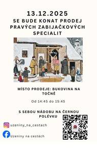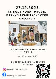 Bukovina: Dnes od 14:45 do 15:45 probehne na tocne prodej tradicnich zabijackovych specialit. Nadobu na cernou polevku nezapomente s sebou.