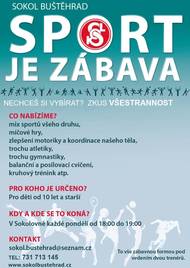 Sport je zábava - ukázková hodina v pondělí 8.9. od 18.00 v sokolovně Chcete aby se vaše dítě naučilo od každého sportu něco a to zábavnou formou? Zkuste Sport je zábava pro děti od 10 let výše. Více informací na www.sokolbustehrad.cz