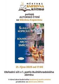 Městská knihovna Buštěhrad Vás zve na autorské čtení se Slávkou Kopeckou z její knihy "Soukromý archiv smíchu", které se bude konat v úterý 21. října 2025 od 17.00 hod. v obřadní síni, v 1. patře buštěhradského zámku. Přijďte strávit příjemný podvečer s knihou plnou vzpomínek, fejeton§ a glos, které Vás pobaví a rozesmějí. S pozdravem a přáním pěkného dne Jana Zemanová Městský úřad Buštěhrad