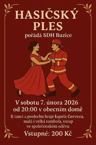 SDH Buzice pořádá tradiční hasičský ples 7.2.2026 od 20:00. K tanci a poslechu hraje kapela Cerveza. V rámci programu je malá i velká tombola. Občerstvení zajištěno na místě. Výtěžek putuje na podporu hasičů SDH v obci Buzice. Těšíme se na Vás. Hezký den Gabriela Málková