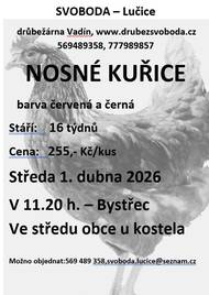 Firma JUKKA bude prodávat v sobotu 28. března 2026 v čase 11.00 - 11.30 hodin na křižovatce u kostela v obci Bystřec následující stromky k jarní výsadbě. Jabloně a jabloně sloupovité, hrušně a hrušně sloupovité i zakrslé, meruňky i sloupovitě zapěstovatelné a kompaktní, nektarinky, nektarinky zakrslé, broskvoně, broskvoně zakrslé, rezistentní švestky vhodné i na pálení, švestkomeruňky, ryngle modré, durancie, třešně, višně, višně keřové, třešňovišně, kaki, mandloně, oskeruše, jedlé kaštany, olivy, vrby keřové i stromkové, moruše, lísky keřové, stromkové rezistentní angrešty, keřové a stromkové rybízy černé, červené a bílé, keřové josty, maliny červené, černé a žluté, malinoostružiny, ostružiny beztrnné, malinojahody, jahody i stáleplodící, rakytník, stolní vinnou révu bezsemennou i rezistentní, kanadské, indiánské a čukotské borůvky, brusinky, klikvu, samosprašné minikiwi a kiwi, aronie keřové, magnolie, rododendrony, stálozelené azalky, motýlí keře, čilimníky, šeříky keřové, mrazuodolné fíkovníky, pustoryl, albízie růžové granátová jablka, weigelie, hortenzie a jiné. Více informací najdete na letácích ve vašich poštovních schránkách.