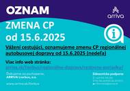 Vážení občania, spoločnosť ARRIVA Liorbus, a.s. oznamujeme zmenu CP regionálnej autobusovej dopravy od 15.6.2025 Viac info web stránka: arriva.sk/liorbus/regionálna-doprava/cestovne-poriadky/