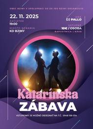 Obec Bziny a ZO JDS Bziny Vás pozývajú na Katarínsku zábavu, ktorá sa uskutoční 22.11.2025 v KD Bziny. Začiatok o 19.00 h.