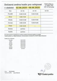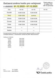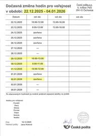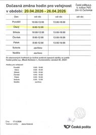 Česká pošta bude mít v následujících dnech omezenou pracovní dobu: ve středu pouze od 8:00 do 11:00, ve čtvrtek a pátek od 13:00 do 16:00.