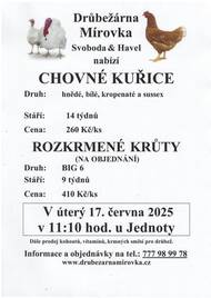 DRŮBEŽÁRNA MÍROVKA, Svoboda-Havel, prodává v úterý 2. září 2025 v 11:10 hod. u Jednoty kuřice hnědé, černé a bílé - stáří 20 týdnů cena 290 Kč/ks. Objednání (doporučujeme) na tel.: 777 98 99 78 nebo drubezarna.mirovka@seznam.cz.